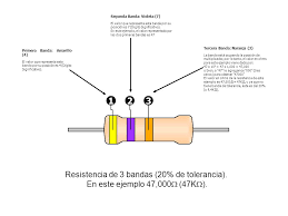 - La tercera banda representa la potencia de 10 elevada al color correspondiente y multiplicado por el número obtenido de la primer y segunda banda.