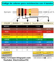 - La cuarta banda representa la potencia de 10 elevada al color correspondiente y multiplicado por el número obtenido de la primer, segunda y tercera banda.
