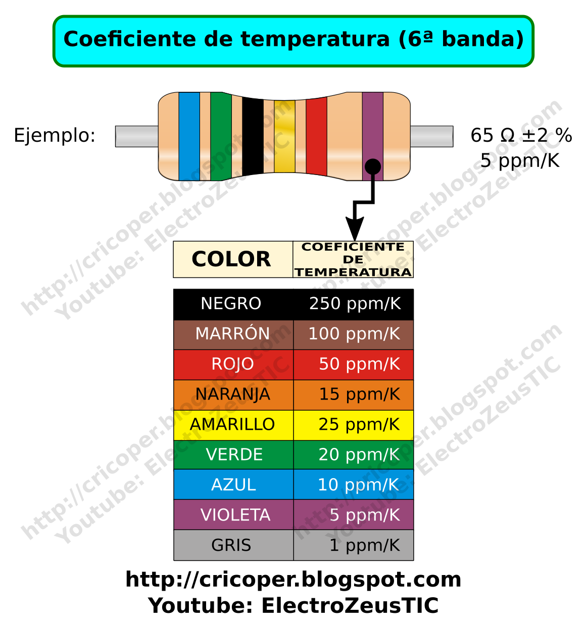 El color más común utilizado para la sexta banda es el negro, que representa 100 ppm / K, esto indica que para un cambio de 100 °C en la temperatura, puede haber un cambio de 0.1% en el valor de resistencia. En general, la sexta banda representa el coeficiente de temperatura. Pero en algunos casos puede representar la confiabilidad y la tasa de fallas.