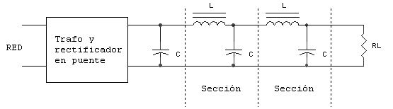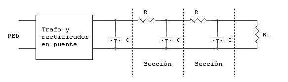 La figura muestra dos filtros RC entre el condensador de entrada y la resistencia de carga. El rizado aparece en las resistencias en serie en lugar de hacerlo en la carga. Unos buenos valores para las resistencias y los condensadores serían: